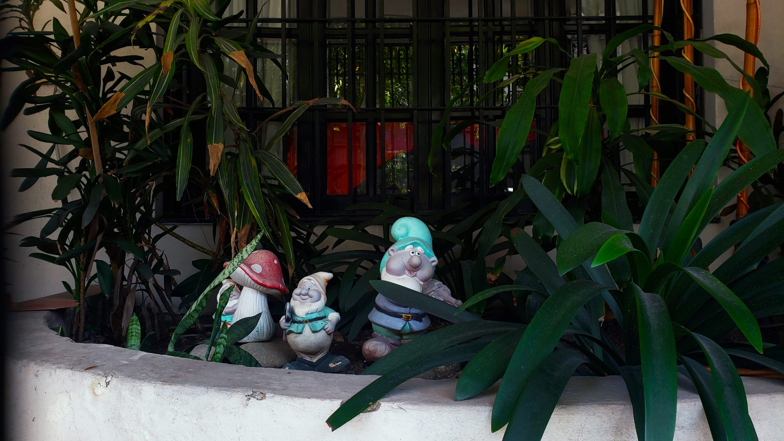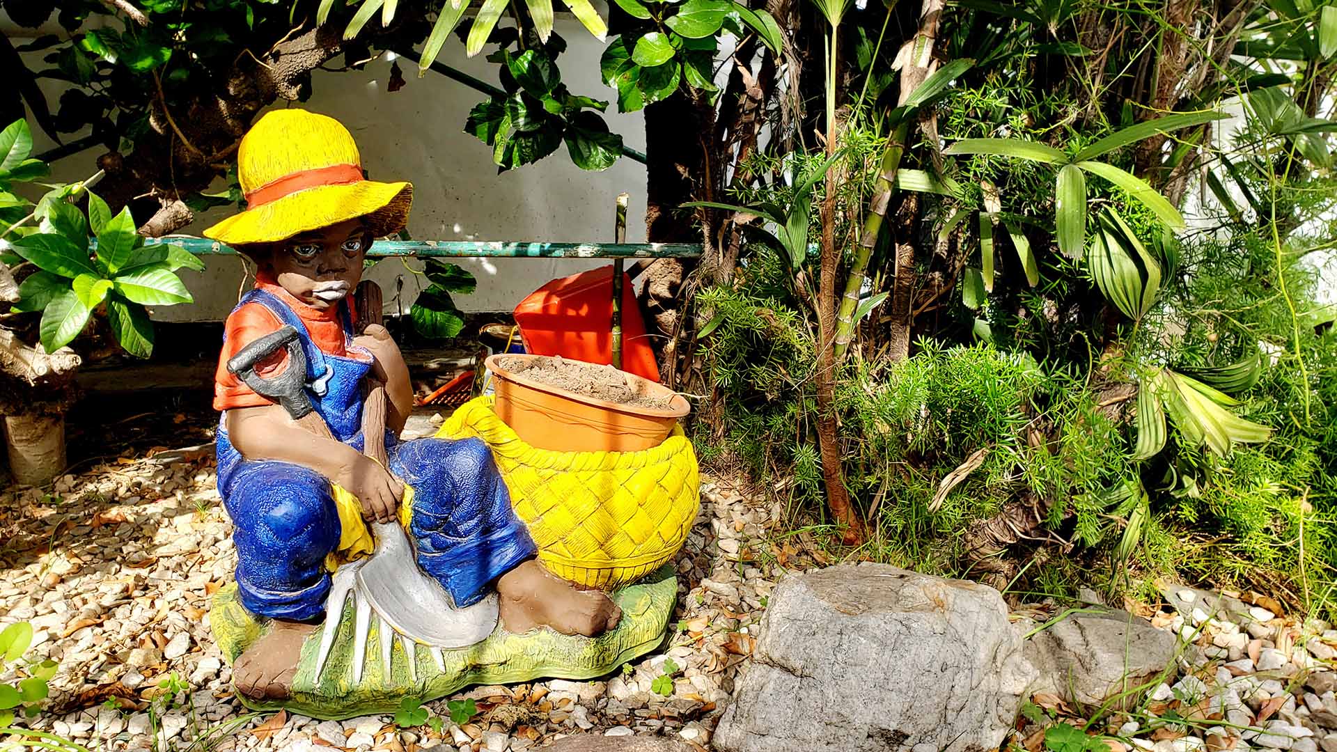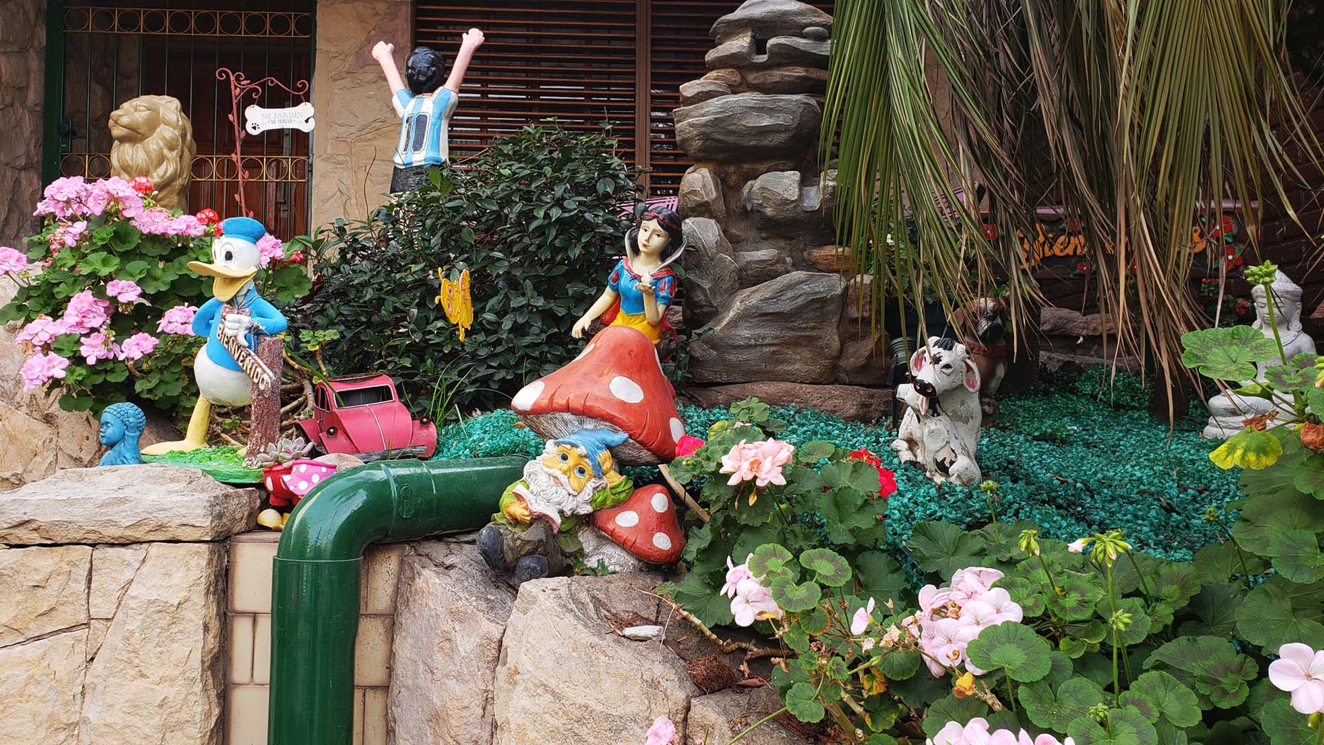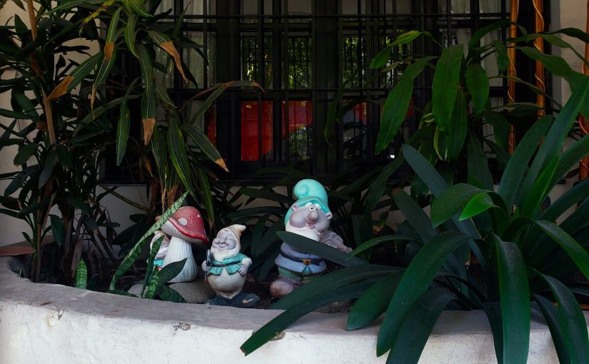 Cuando camino, llaman mi atención los decorados de los jardines de las casas (también patios, balcones, entradas). Intuyo, por la presencia de duendes, tótems, hadas y conejos, que allí se desata cierta fantasía. La presencia de lo afro trabajando la tierra, en algunos espacios, indica otro cliché (¿racista, acaso?) inscripto en nuestras sociedades.