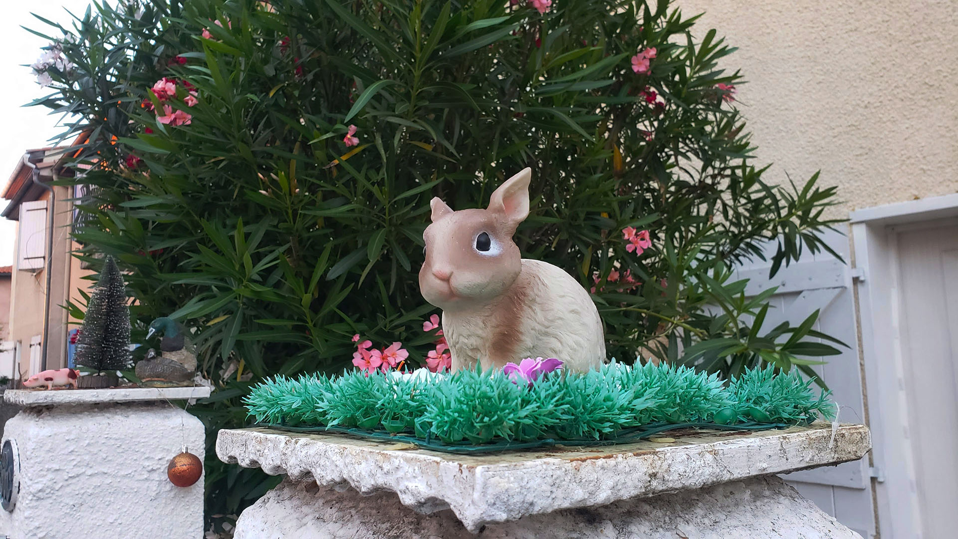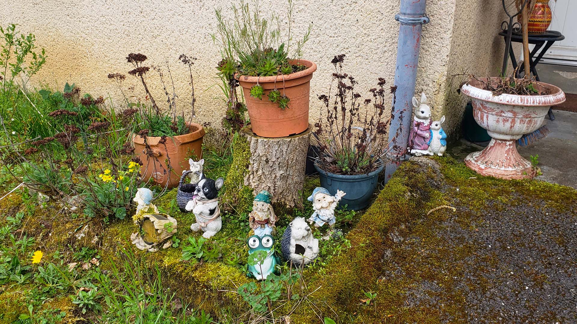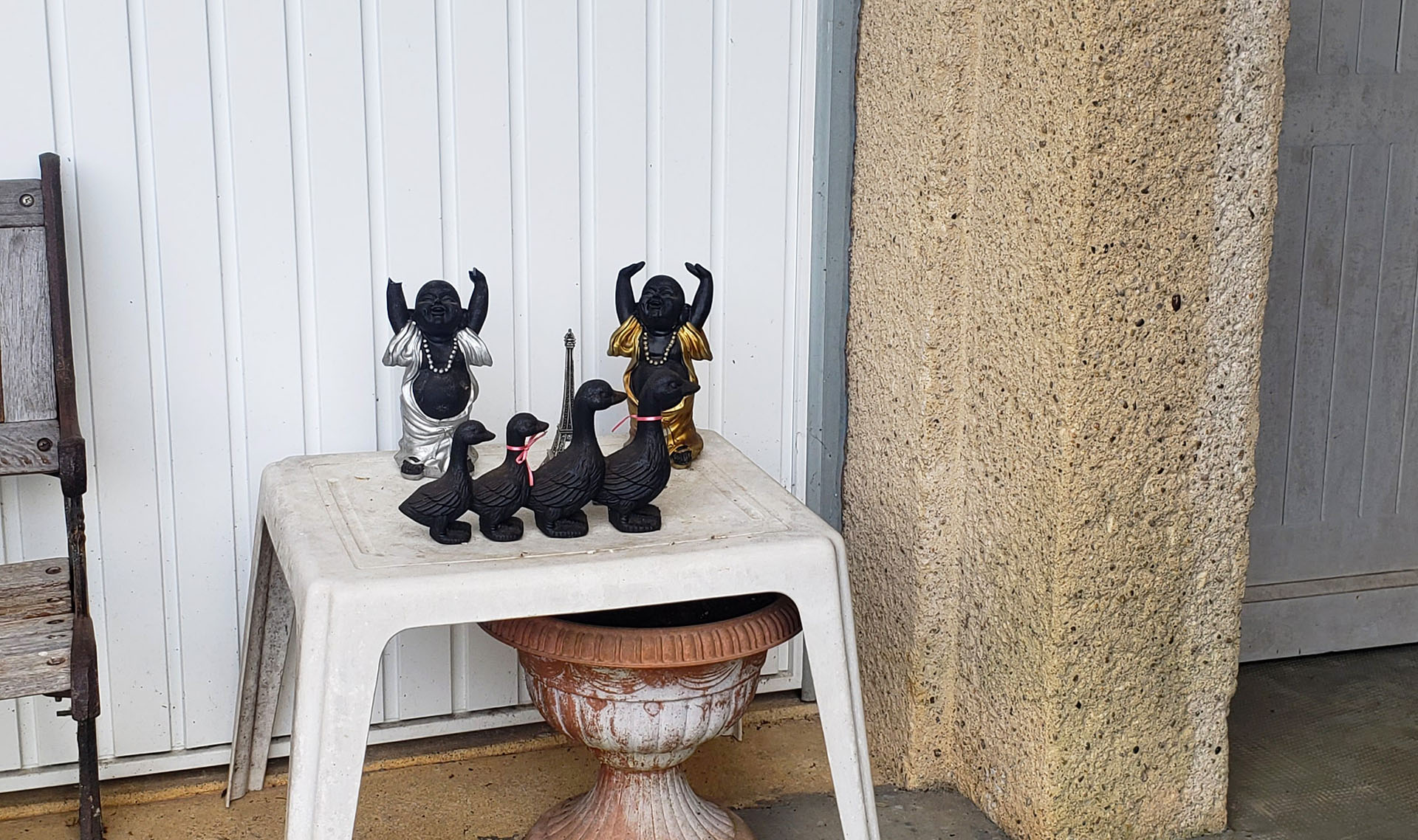 Cuando camino, llaman mi atención los decorados de los jardines de las casas (también patios, balcones, entradas). Intuyo, por la presencia de duendes, tótems, hadas y conejos, que allí se desata cierta fantasía. La presencia de lo afro trabajando la tierra, en algunos espacios, indica otro cliché (¿racista, acaso?) inscripto en nuestras sociedades.